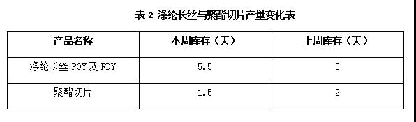 本周,涤纶长丝POY及FDY与聚酯切片的库存分别为5.5和1.5天。涤纶长丝本周库存较上周上涨0.5天,聚酯切片库存较上周下滑0.5天。